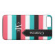 This personalised black, white, turquoise blue, and coral pink Case-Mate custom iPhone 7 case has a wide bold striped background pattern and a black banner ribbon with white stitching that you can add your name, initials, monogram or other text to. This modern and trendy new case makes a chic statement for the hip young fashionista! If you need assistance, email niteowlstudio@gmail.com.