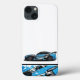 This iPhone case is shown in a white colour with a auto race car art print.