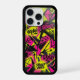 A top-down, flat lay photograph of an iPhone, possibly an iPhone 13 Pro model, encased in a custom, vibrant street-art designed protective case. The case features a chaotic yet dynamic collage of fragmented geometric shapes and bold graffiti tags, rendered in a high-contrast palette of electric neon yellow, hot pink, and black. Text elements are integrated into the design, including 'URBAN', 'STREET', 'EDGY', and 'STREET VIBES', all in stylized graffiti fonts. Key visual elements include a multi-faceted diamond icon at the top right and numerous arrows and stylized line-work woven throughout the pattern. The camera array is clearly visible through a precise cutout. The phone lies centered against a clean, neutral, finely textured grey surface. The overall aesthetic is raw, energetic, and urban.