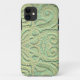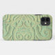 This unique phone case features a close up image of a ceramic tile with a complex intricate green glaze.