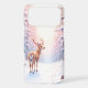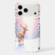 Watercolor painting of a deer in a snowy forest, the deer is light brown with a white heart shape on its rear, it has antlers and is looking to the right, the forest is full of tall trees covered in snow, the snow is white and the trees are a mix of brown, pink and purple, the sky is white and bright, the painting is done in a soft and delicate style, with a focus on the details of the deer and the forest, the color palette is pastel and the lighting is soft and diffused.