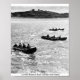 Vintage Ireland poster view of currach boats at sea off Inisheer Aran Island. The ruins of O'Briens castle dating from 14th century visible in background on the island. Early 1960's Ireland photo by Brendan Doyle.