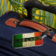 Digital graphic Irish flag, woven texture, black tape text overlay