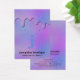 The background of our iridescent foil earring display blends shades of pink, purple and blue in an artistic abstract pattern... perfect for creatives who design jewellery as their business or side hustle. Holographic metallic drips taken from the same pattern have an embossed look as they border the top of the card. The embossing is a graphic technique that is printed on the paper, rather than being an actual physical element overlaid on the card. On front of the card are two printed circles to guide your punching of the holes for the earrings and, below that, your business name and boutique services. All text on front and back of this jewellery display card can be easily and quickly revised on the personalisation template.