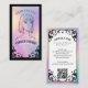 Elevate your hair salon or stylist brand with our Iridescent holographic vintage hair salon business card, featuring a hand-drawn ornate scroll frame set against a faux iridescent holographic background for a striking, tarot-inspired look. The front showcases a mannequin woman's face centered within the scroll design, leaving space for your company name and tagline, while the reverse displays elegant flourishes, an iridescent holographic frame, and your contact information with a QR code for easy bookings. The dramatic blend of black and paired with shimmering holographic accents creates a sophisticated gothic aesthetic, perfect for hair salons, hair stylists, barber shops, and beauty professionals seeking a unique, mystical, and vintage-inspired presentation. Design and illustration created by ©Moodthology Papery.