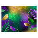 Textural iridescent mardi gras background with spots of purple, yellow and green, decorated with fluffy feathers and shiny beads. Mardi gras holiday.
