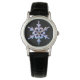 Icy, iridescent, pink, blue & white snowflake, vivid against a black background