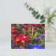 The focus is on a crimson flower in the foreground, with a rainbow of blooms surrounding it.