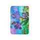 My original water colour painting printed on a bathmat featuring purple iris blossoms and a Monarch butterfly at sunrise.