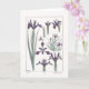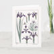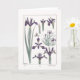 A blank greeting card with a botanical illustration of iris flowers in purple, by the French artist Maurice Pillard Verneuil. A lithograph using the pochoir method of hand colouring drawings, which has been digitally enhanced and altered.