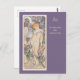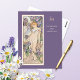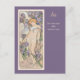 A postcard with the vintage illustration by Alphonse Mucha from The Flower Series, Iris (1898), which has been digitally restored and enhanced. A portrait of a woman in an evening gown surrounded by lavender iris blooms.