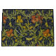This design features a print of a fabric design created by the British artist William Morris (1834–1896), who is associated with the Arts and Crafts Movement. It depicts blue and orange iris flowers in an elegantly symmetrical pattern. The flower is named after Iris, who was the Greek goddess of the rainbow and a messenger for the Olympian gods, carrying messages down to humanity. The leaves and stems of the iris plants are depicted in blue and green. There are a few yellow birds perching on some of the plants' foliage. The original pattern was designed by William Morris in 1887.