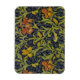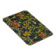 This design features a print of a fabric design created by the British artist William Morris (1834–1896), who is associated with the Arts and Crafts Movement. It depicts blue and orange iris flowers in an elegantly symmetrical pattern. The flower is named after Iris, who was the Greek goddess of the rainbow and a messenger for the Olympian gods, carrying messages down to humanity. The leaves and stems of the iris plants are depicted in blue and green. There are a few yellow birds perching on some of the plants' foliage. The original pattern was designed by William Morris in 1887.