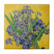 Irises in vase against yellow background, one of Vincent van Gogh's most famous floral still life paintings.