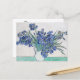 A fine art postcard with the post-impressionist painting, Irises (1890), by the Dutch artist Vincent Van Gogh (1853-1890). He was influenced by Japanese art in his many of his iris paintings. Beautiful blue-violet irises in a vase against a white background.