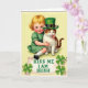 This greeting card shows a golden-haired child with bright blue eyes and rosy cheeks hugging a calm tabby cat close, their faces turned toward each other with an easy, affectionate closeness 💚. The child wears a green-and-white plaid dress, and the cat’s white, ginger, and brown fur is softly shaded with gentle stripes. Behind them is a pale yellow-green background that looks lightly luminous, keeping the focus on the cuddle at center. The cat adds a St. Patrick’s Day touch with a tiny leprechaun top hat featuring a black band and a small gold buckle ☘️. Soft lighting smooths the scene, giving the child’s smile and the cat’s relaxed posture a cozy, friendly feel. Along the lower portion, a flowing banner stretches across the card with the words “KISS ME I AM IRISH” set in emerald green lettering. Small four-leaf shamrocks sit on either side of the banner, and the cat’s striped tail curls upward in a gentle arc near the bottom edge.