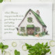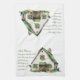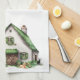 St. Patrick's Day kitchen towel featuring a watercolor illustration of a classic white Irish farmhouse with green shudders, a pair of wellies near the barn door, flowers in window boxes, two butterflies in the shades of the Irish flag, a baby lamb peaking out from the right of the barn, a black and white cow peaking out from the left of the home and a golden retriever laying in the front. To the left of the image, an Irish Blessing - May your troubles be less, your blessings be more and nothing but happiness come through your door in a green font.