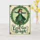 The front design shows a woman standing full-length inside a circular wreath of shamrocks, her arms open as if she’s welcoming someone close with an easy, friendly warmth 💚. She wears layered emerald greens—a wide-brim hat, a tailored coat, and a flowing dress that looks like it’s caught mid-sway—giving the scene a gentle, old-time charm. Her auburn hair falls in soft waves, and a small gold necklace sits at her collar, adding a tender touch like she dressed up for a special meet-up. The shamrock ring is a rich green, and the space inside it fades to a light lime tone, while the outer background shifts to a creamy, aged-paper color. Beneath her, the words “Erin Go Bragh” sit centered near the bottom in dark green lettering, with curling vine details and extra shamrocks around the text ☘️. The careful contrast of greens against warm off-white makes her smile and open posture feel like an invitation to step closer. Share St. Patrick’s Day sentiments with someone you care about.