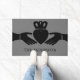 This doormat has a simple hand drawn style illustration of an Irish claddagh heart traditionally found on claddagh rings. The graphic is in black set against a grey background