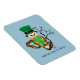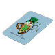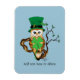 A cute barn owl wearing green leprechaun top hat with two clovers in it.