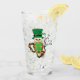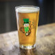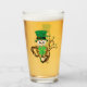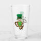Cute barn owl wearing a green leprechaun top hat with two clovers in it.