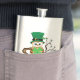 Cute barn owl wearing a green leprechaun top hat with two clovers on it.