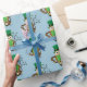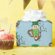 A cute barn owl wearing a green leprechaun top hat with two clovers in it