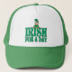 This cute St. Patrick's Day design features a little green leprechaun with a big shamrock in his hat sitting on top of large green text "Irish For A Day.
