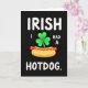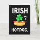 This design shows a black background with large white text reading “IRISH I HAD A HOTDOG,” arranged in a centered stack that feels like a cheeky note shared between friends on St. Patrick’s Day 💚. In the word “IRISH,” a bright emerald shamrock replaces the “SH,” its soft highlights making it look gently lit, like a lucky charm slipped into the message ☘️. The clover sits right in the middle of the top line, drawing your eye the way a knowing glance does when two people share the same joke. Beneath the text, a cartoon hotdog rests front and center, with a red sausage tucked into a warm golden-brown bun. A wavy stripe of yellow mustard zigzags across the top, adding a cozy, craveable detail that feels like an easy date-night snack. The spacing around each element keeps the joke easy to read, with the white letters standing out sharply against the dark background. The overall layout stays simple and focused, with the shamrock acting as the visual bridge between the wordplay above and the hotdog below. The mustard line curves in three loose waves from left to right across the sausage.