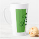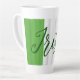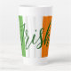 Irish colours tall latte mug with flag of Ireland image. Irish text in dark green script wraps around a tall white coffee mug.