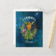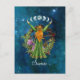 Beautiful postcard watercolor illustration features moon goddess in emerald green gown with flaming red hair on celestial skies background. Customisable with script text in white