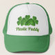 A green shamrock design for St Patrick's Day with plastic paddy text