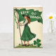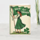 This card features a vintage-style illustration of a poised red-haired woman in an emerald green pinafore dress and a matching wide-brim hat with a striped ribbon, set against a warm cream background. Her curls fall over one shoulder, and the soft smile on her face feels like a friendly invitation to step closer. She lifts a flowing green flag that stretches behind her in the breeze, and the white text “ERIN GO BRAGH” sits centered across the fabric in large, easy-to-read letters 💚. A small green-and-white ribbon is tied near the top of the flagpole, adding a gentle, thoughtful touch. Along the hem of her skirt, small white shamrock motifs repeat in a neat border, echoing the St. Patrick’s Day theme ☘️. Below, she stands on a grassy mound sprinkled with tiny shamrocks that lead your eye toward the foreground. In the lower right corner, a large three-leaf clover is drawn with strong outlines and deep green shading.