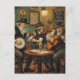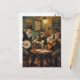 A vintage postcard of musicians in a traditional Irish pub capturing a warm, lively scene of musicians playing guitars, banjos and fiddles, all bathed in the soft glow of candlelight and aged wood.