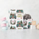 A teal blue pickup truck carries a decorated Holiday tree and gift packages on this cute gift wrapping paper. A beautiful red Irish Setter Dog looks out from the tailgate. A rustic wooden sign on the back bumper says "Christmas Cheer". Your monogram is enclosed within a pretty pine cone and red berry wreath, and stylised gold text says "Merry Christmas". You may also customise the "from the (Name) section.