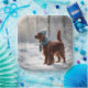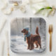 An Irish Setter dog with a cosy hat and scarf stands in a snowy forest gazing into the distance