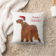 Irish setter in snow with Santa Claus hat and snowflakes.