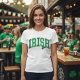 This fun St. Patrick's Day t-shirt features the word 'IRISH' in a curved distressed retro font in light and dark green colours with a coordinating shamrock.