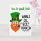 This card features a white background with a friendly leprechaun on the left, smiling wide with bright aqua eyes that seem to linger warmly as if he’s sharing a private joke with you 💚. His fiery orange beard and mustache frame rosy cheeks, and he wears an emerald green top hat with a black band, a gold buckle, and a small dark shamrock detail ☘️. A short dark blue pipe rests near his mouth, sending up a thin curl of grey smoke that drifts upward. On the right, the humor comes through in stacked text that feels like a lighthearted nudge between friends. Near the top, “how to speak Irish” appears in green lettering, centered above the larger phrase below. Under it, “WHALE OIL BEEF HOOKED” is set in black, all caps, taking up the most space, with “(say it fast)” in smaller black text beneath it. The leprechaun’s hat tilts slightly, and the smoke wisp rises in a soft curve beside his face.