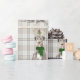 An adorable watercolor illustration of a Irish Wolfhound, pairs with a neutral taupe plaid patterned background, and the dog wears a green winter scarf and antlers.