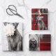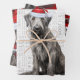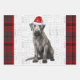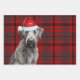 An adorable Irish Wolfhound dog is ready for the holiday season with his Santa hat. This cute Christmas dog is paired with a red and gray holiday plaid on this set of gift wrap for the dog lover.