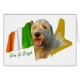 Note card for any occasion. Lovely wheaten Irish Wolfhound with Irish flag and harp. Includes Gaelic phrase "Erin Go Bragh" Ireland Forever. Inside small Black and white head study of 3 wolfhounds With pleanty of room to write your personal greeting or note