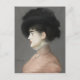 Irma Brunner by Edouard Manet, pastel painting c. 1880, is a profile portrait of an elegantly dressed young French woman in salmon pink blouse with high collar and ruffles with a large, black feathered hat over her tied back, dark brown hair. Manet boldly contrasts smoothly modelled pastel tones with deft strokes of the pastel chalks defining the sitter’s features and details, in a brilliant tonal range from the porcelain whites of the woman’s complexion to the deep, velvet blacks of her hat and hair. The artist creates a striking image of a stylish young woman of 19th century Paris, painted spontaneously as if capturing a fleeting moment in time.