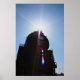 A historic steam engine rises into the midday sun in Kingman, Arizona, its silhouette framed by a bright sky and natural lens flare. The perspective emphasizes scale and strength, capturing a moment where industrial history meets harsh desert light.