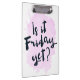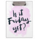 This fun clipboard features a watercolor splash background and the words Is it Friday yet? in a bold chunky script.