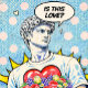 This artwork features a timeless marble figure holding a vibrant bouquet of flowers, paired with a playful speech bubble that reads “Is This Love?” — blending classical art history with modern pop culture and romantic humor.