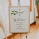 This wedding welcome sign features an elegant watercolor greenery leaf and modern minimal design. This welcome poster is the perfect addition to your outdoor garden or classic wedding event.