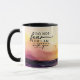 Coffee mug with inspirational quote scriptures depicts a beautiful nature watercolor design with a golden ocean sunset over the water. It features two encouraging Bible Verses: one from Isaiah 41:10, "Do not fear for I am with you." and Deuteronomy 31:6, "Do Not Fear I go with you."
