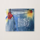 Inspirational quote scripture jigsaw puzzle depicts a watercolor lighthouse with the light shining through the blue snow filled night sky. It features a portion of Bible Verse Isaiah 60:20, "The Lord will be your everlasting light."