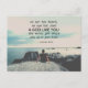 Inspirational quote scripture postcard depicts a man setting on the sea shore looking out at the ocean and beautiful sky and clouds. It features Bible Verse Isaiah 64:4, "no ear has heard, no eye has seen a GOD like you who works for those who wait for him!"
